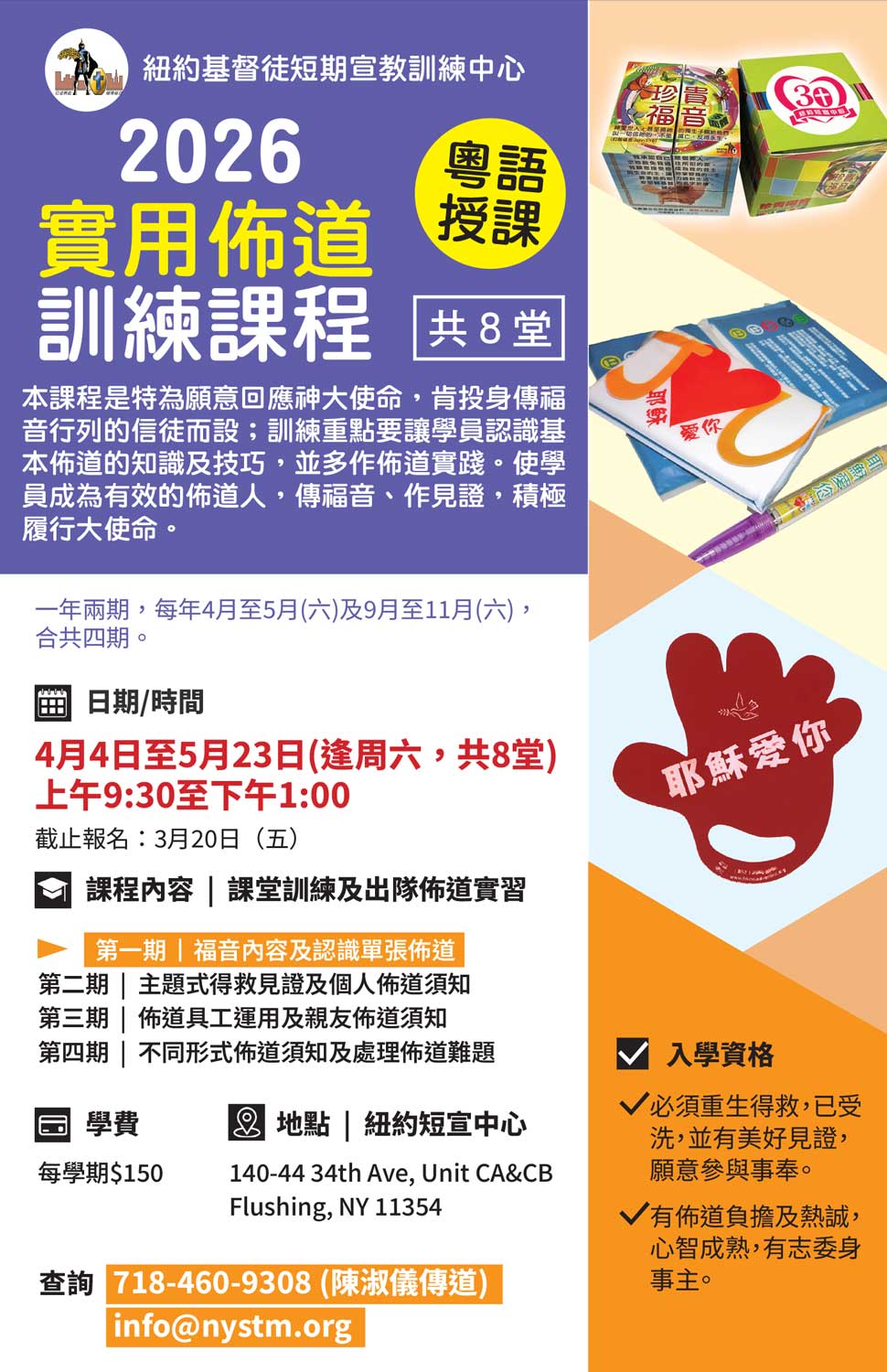「實用佈道訓練課程」春季開班日期為4月4日至5月23日(逢周六) 上午9:30-下午1:00 。請為招生禱告,求神興起信徒願意受訓裝備,作天國福音精兵。