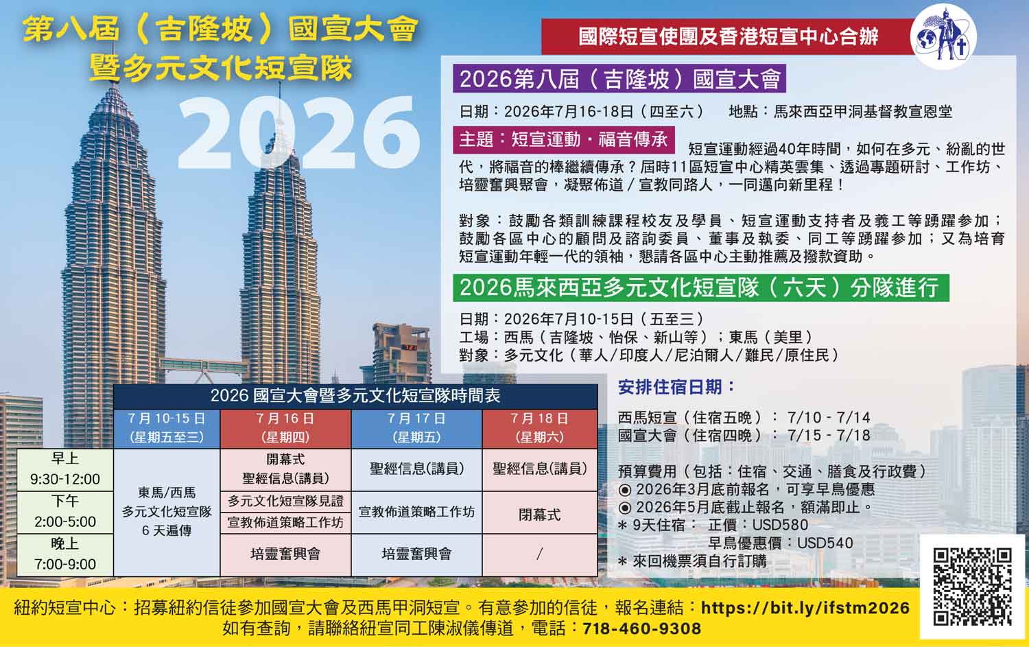 「2026第八屆(吉隆坡)國宣大會及福音遍傳」,主題為「短宣運動 • 福音傳承」,日期為2026年7月10-18日(共九天),其中有六天為西馬短宣。請為紐宣招募信徒報名參國宣大會及西馬甲洞短宣禱告。