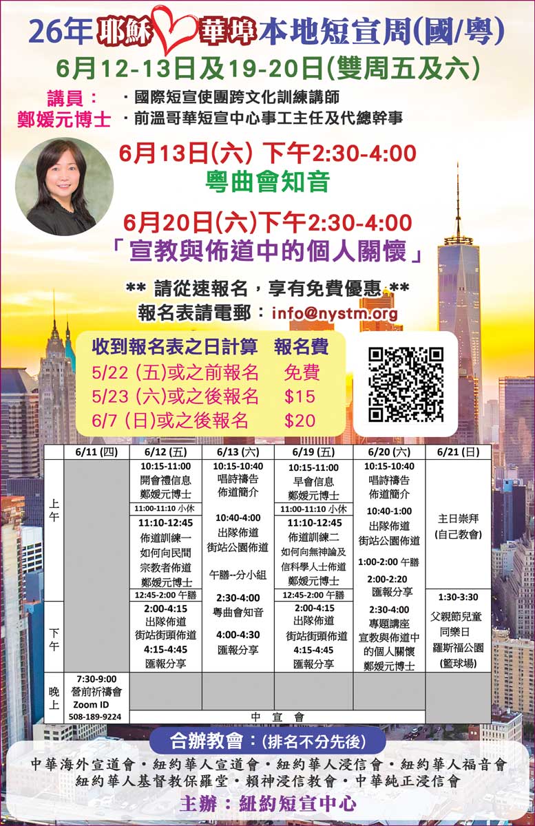 2) 耶穌愛華埠 (國粵雙語組):講員鄭媛元博士 (詳情請參閱海報)